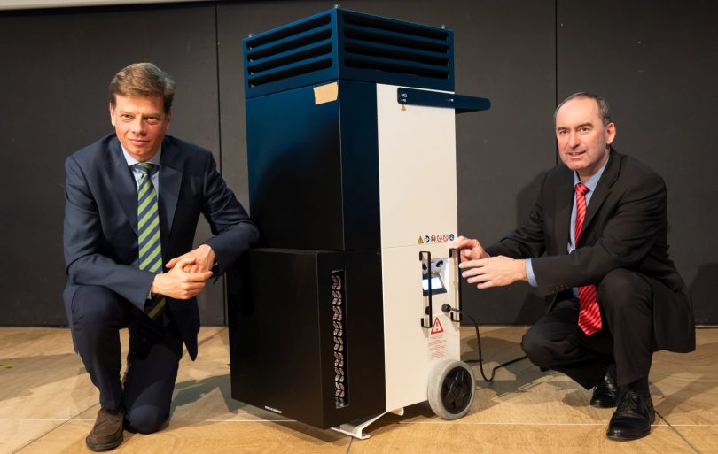 Wirtschaftsminister Aiwanger hat sich in Neubiberg gemeinsam mit Prof. Dr. Christian Kähler von der Universität der Bundeswehr München über die Funktionsweise von Raumluftreinigern ausgetauscht. Wie aus den Untersuchungen von Prof. Kähler hervorgeht, können handelsübliche Geräte mit einem hochwertigen Schwebstoff-Filter die Aerosolkonzentration in Räumen mit einer Fläche von 80 m² je nach Volumenstrom in 6 bis 15 Minuten halbieren.
