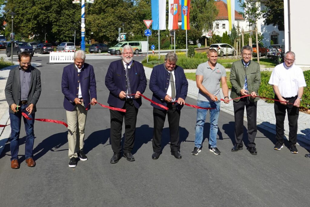 von links nach rechts) Sebastian Gaigl (ALE Oberbayern), Gerhard Hajer (Planungsbüro), Zweiter Bürgermeister Sebastian Friesinger, Erster Bürgermeister Rudolf Schreyer, Bauleiter Georg Stuffer, Landrat Otto Lederer und Pfarrer Josef Huber geben die neue Ortsdurchfahrt frei.