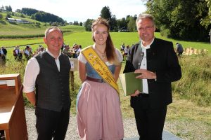 Bürgermeister Daniel Mair – die Bayerische Honigprinzessin Alexandra Krumbacher – Pfarrer Paul Janßen bei der Einweihung des neuen Lehrbienenstandes