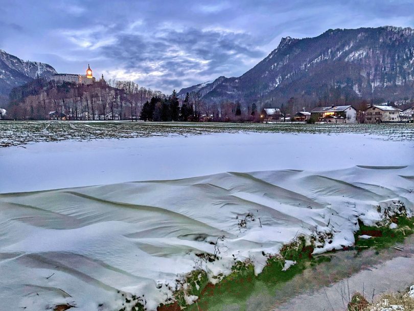 Die blaue Stunde neigt sich im Priental und die Dunkelheit hält mehr und mehr Einzug. Eine beachtlichen Kontrast bietet dabei die weiße Pracht die durch die mächtigen Schneewächten ein wunderschönes Bild abgeben. Schloss Hohenaschau und Zellerhorn zeigen sich dabei als Aschauer Wahrzeichen wie immer beeindruckend und imposant.