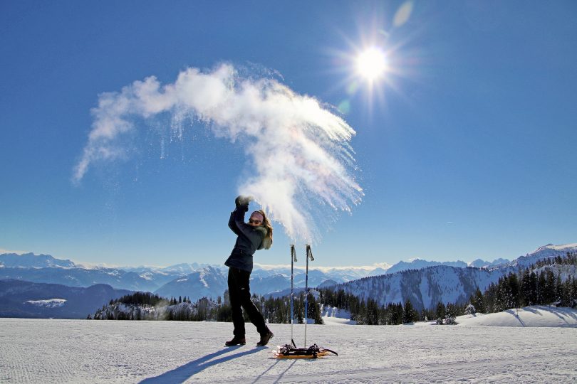 Die Schneeschuhe anlegen und die traumhafte Winterlandschaft genießen. Eine Runde durch die weiße Pracht wandern und als Belohnung das beeindruckende Panorama, wie hier auf der Kampenwand bestaunen. Glasklar ist bei der klirrenden Kälte die Fernsicht und die benachbarten überzuckerten Berggipfel räkeln sich in den blauen Himmel. Da ist die Freude, wie hier bei der Mitarbeiterin der Aschauer Tourist Info, Corinna Sperger, groß dieses Naturschauspiel zu genießen. Ein perfektes Bild entstand, als das mitgebrachte heiße Teewasser aus der Thermoskanne in die Luft gewirbelt wurde. Beim sogenannten Mpemba-Effekt, bildet das heiße Wasser in der kühlen Luft sofort Eiskristalle.