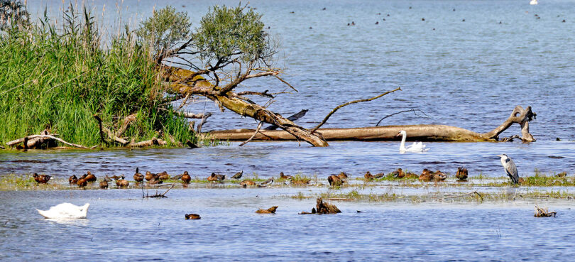 Im Westen des Turms halten sich neben vielen Enten einige Kiebitze, Graureiher und Höckerschwäne auf.