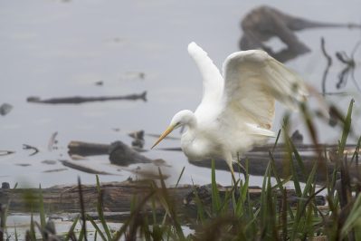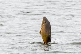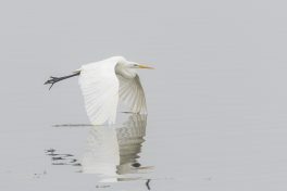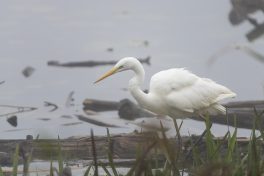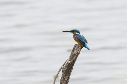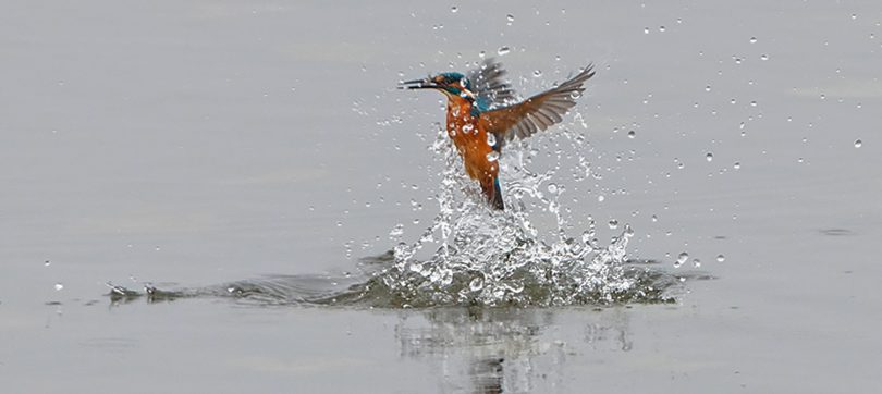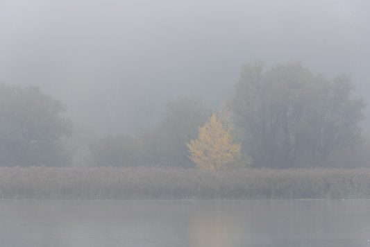Der Herbst hält seinen Einzug und mit ihm der Nebel, der an diesem Tag bis zum frühen Nachmittag anhielt. Die ersten Bäume zeigen deutliche Färbung und auch die Blätter fallen schon. Neben verschiedenen Enten war der Eisvogel einer der ersten die sich im Nebel zeigten, von verschiedenen Ansitzen aus war er durchaus erfolgreich beim Fischfang. Mehrfach zeigte er sich vor dem Turm und begeisterte mit seiner Flugakrobatik. Zwischendurch versuchte sich erfolglos ein Silberreiher mit der Jagd auf Nahrung, auch er kam mehrfach am Turm vorbei, ging aber immer leer aus. Weiter vom Ufer entfernt zeigten Karpfen ihre Sprungkraft, manche glitten fast ganz aus dem Wasser und platschten gut hörbar wieder ins Wasser.