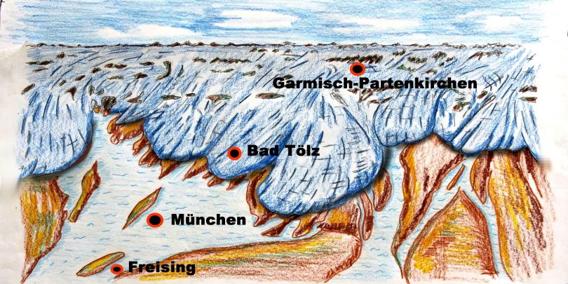 Dort, wo heute Oberbayern im Voralpenland sich befindet, sah es vor ca 12.000 Jahren ganz anders aus. Die Landschaft war überdeckt mit Eis. Temperaturen von minus 50 Grad formten eine Eisdecke über die Alpen. An der Position Garmisch war der Eisschicht ca 1000 m dick. Nur die Bergspitzen schauten aus dem Eispanzer. Vermutlich gab es zu der Zeit kaum Lebewesen.