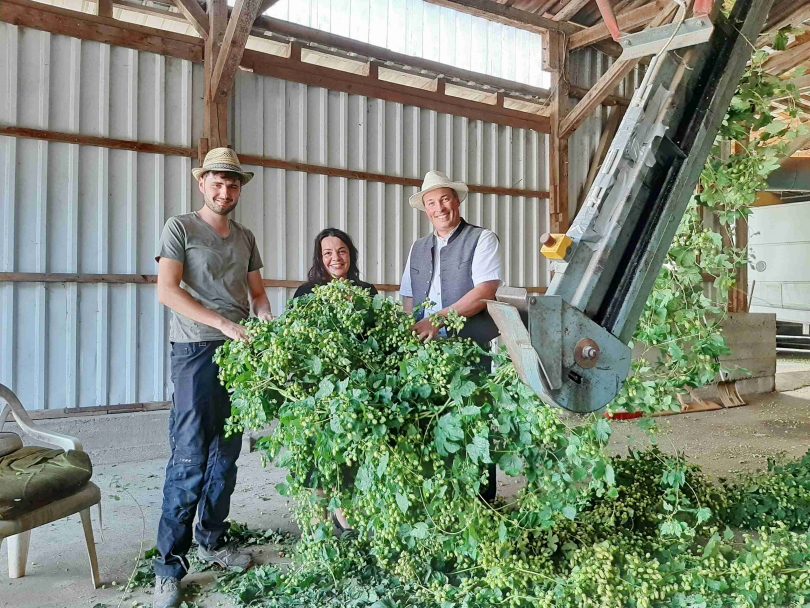 Jungbauer Michael Schneider präsentierte seine Hopfengärten mit den Sorten Hallertauer Tradition, Herkules und Hallertauer Magnum. Außerdem betreibt er mit seinen Eltern Gerlinde und Franz noch Milchviehhaltung und hält Legehennen, deren Eier an regionale Abnehmer geliefert und über den eigenen Hofladen vermarktet werden. Bei unserem Besuch wurde gerade die Hopfensorte Hallertauer Tradition geerntet, eine beliebte Aromasorte mit einem Lupolin-Gehalt von 6 – 7 Prozent Alfa. Hopfen ist mit seinen sieben Metern Wuchshöhe eine absolut riesige Pflanze, aber von Interesse für den Anbauer ist nur das Lupolin, das sich in der Hopfendolde befindet. Dieses wird von den Hopfenverwertungsgesellschaften extrahiert, in Dosen verpackt und an die Brauwirtschaft weiterverkauft. Aber bevor die Hopfendolden getrocknet, in Säcken zu 60 – 70 kg verpackt, an die Hopfenverarbeiter geliefert werden können, ist es ein weiter Weg.
