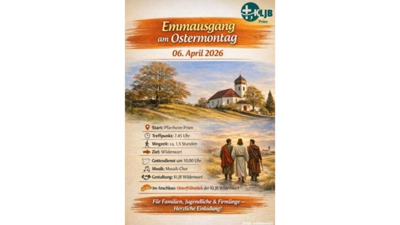 Zu einem gemeinsamen Emmausgang am Ostermontag, 6. April 2026, laden die katholische Jugend Prien und die KLJB herzlich ein. Familien, Jugendliche und insbesondere Firmlinge sind eingeladen, sich auf den Weg von Prien nach Wildenwart zu machen und Ostern gemeinsam zu feiern.