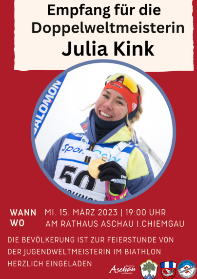 Die Gemeinde mit Tourist Info Aschau i.Chiemgau lädt in Zusammenarbeit mit dem WSV Aschau i.Chiemgau und der Gemeinde Frasdorf am Mittwoch, 15. März 2023 um 19.00 Uhr an das Rathaus Aschau i.Chiemgau zu einer öffentlichen Feierstunde für Doppelweltmeisterin Julia Kink ein. Zweimal Gold und zweimal Silber ist die unglaubliche Bilanz der jungen Athletin die für den WSV Aschau i.Chiemgau an den Start ging. Eine Goldmedaille erkämpfte sich Julia in der Staffel und die zweite, das freut Julia besonders, im Einzel. Auf die Siegertreppe für Silber durfte sich auch mit der Mixed-Staffel und Sprint-Wettbewerb. Eine grandiose Leistung der jungen Sportlerin, die gebührend mit einem festlichen Empfang gewürdigt werden soll. Alle Bürger/innen sind herzlich eingeladen, mit Julia zu feiern. Neben verschiedene Festansprachen gibt es auch noch durch die frisch gebackene Doppelweltmeisterin den Eintrag ins Golden Buch der Gemeinde Aschau i.Chiemgau.