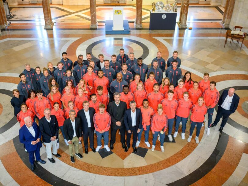 Ministerpräsident Dr. Markus Söder hat am 10. September 2025 die 1. Frauen- und Herrenfußballmannschaft des FC Bayern München im Kuppelsaal der Bayerischen Staatskanzlei empfangen.