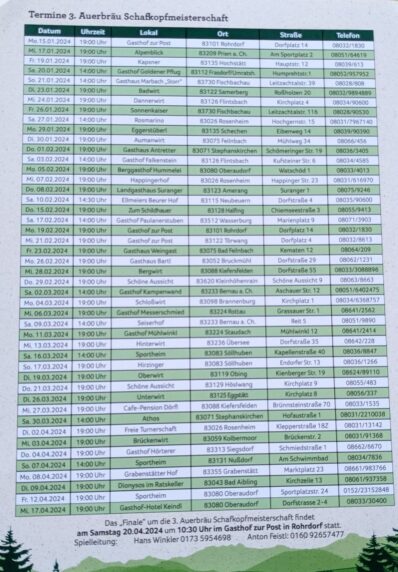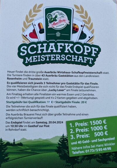 Nun geht es in den Endspurt beim Auerbräu Wirtshausschafkopfen am Freitag, 12. April in Oberaudorf im Sportheim und im dortigen Gasthof Keindl am Mittwoch, 17. April (jeweils 19 Uhr). Das sind die letzten Chancen, sich für das Finale mit vielen Geld- und Sachpreisen am Samstag, 20. April im Gasthof “Zur Post” in Rohrdorf zu qualifizieren.
