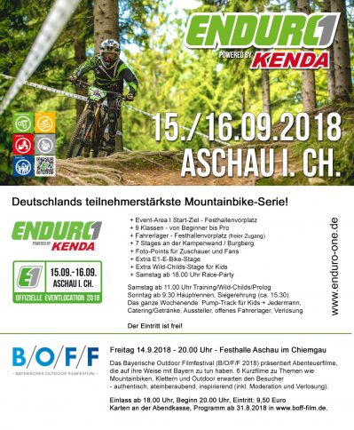 Darüber hinaus freuen wir uns, dass wir das Bayerische Outdoor Filmfestival B/O/F/F als Partner gewinnen konnten. Am Vorabend der ENDURO ONE, am Freitag, den 14. September, zeigen die Macher in der Festhalle beeindruckende und exklusive Kurzfilme rund um die Themen Mountainbiking, Bergsport und Adventure. Einlass ist ab 18.00 Uhr, Beginn ist 20.00 Uhr. Karten gibt es für 9,50 Euro an der Abendkasse. Mehr zum B/O/F/F ist unter www.boff-film.de sowie im Trailer zu erfahren.
