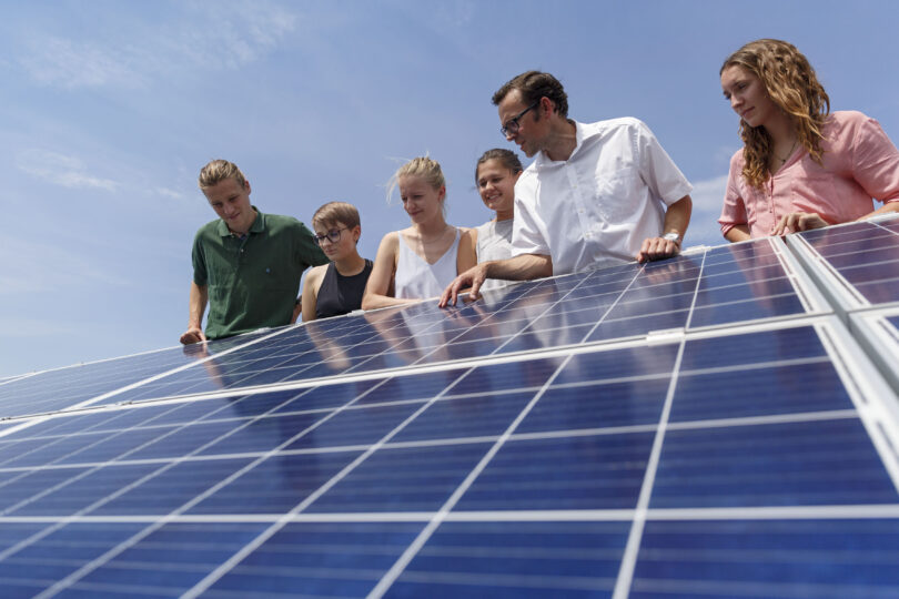 Bericht und Foto: TH Rosenheim – Prof. Frank Buttinger (Zweiter von rechts) mit Studierenden der Energie- und Gebäudetechnologie an einer Photovoltaik-Anlage an der Hochschule. Bild: Florian Hammerich