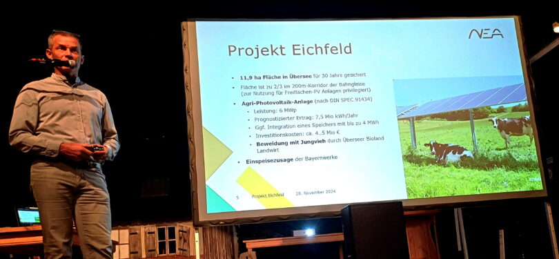 Übersee/Achental. Vor über 150 interessierten Bürgern stellte die Bürger-Energiegenossenschaft NEA im Rahmen einer Informationsveranstaltung im Saal des Wirtshaus D´Feldwies vor, wie sie die Energiewende im Achental voranbringen und den Klimawandel eindämmen will. Vorstand Dr. Matthias Fauser führte als Referent und Moderator durch die Veranstaltung und präsentierte als erstes das Projekt „Eichfeld“, südlich der Bahngleise von Übersee, die „Agri-PV Friedhofsstraße“, wie sie bereits mehrfach im Bauausschuss und Gemeinderat behandelt wurde (wir berichteten). Mit einem geschätzten Ertrag von 7,5 Millionen kWh pro Jahr soll elektrische Energie emissionsfrei erzeugt werden, um den Jahresverbrauch von rund 2500 Haushalten zu decken.