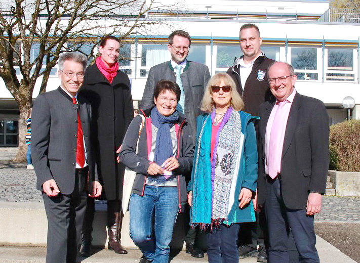 Trafen sich zum gemeinsamen Austausch (von links nach rechts) Landrat Otto Lederer, Abteilungsleiterin Heidi Markov, die Leiterin des Betreuungsteams des Kreis Migration Bad Aibling Barbara Kleeblatt, Bad Aiblings Bürgermeister Stephan Schlier, die Vorsitzende des Helferkreises Petra Mareis, Hallenmanager Christian Haak, der Schulleiter des Gymnasiums Bad Aibling Michael Beer.