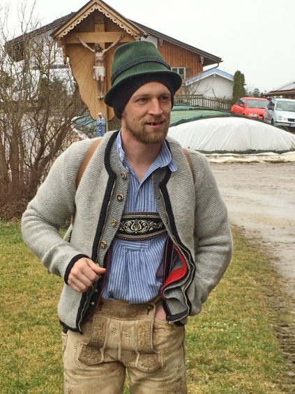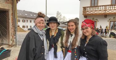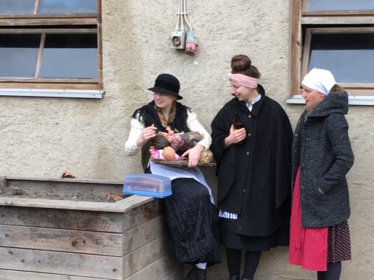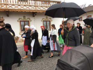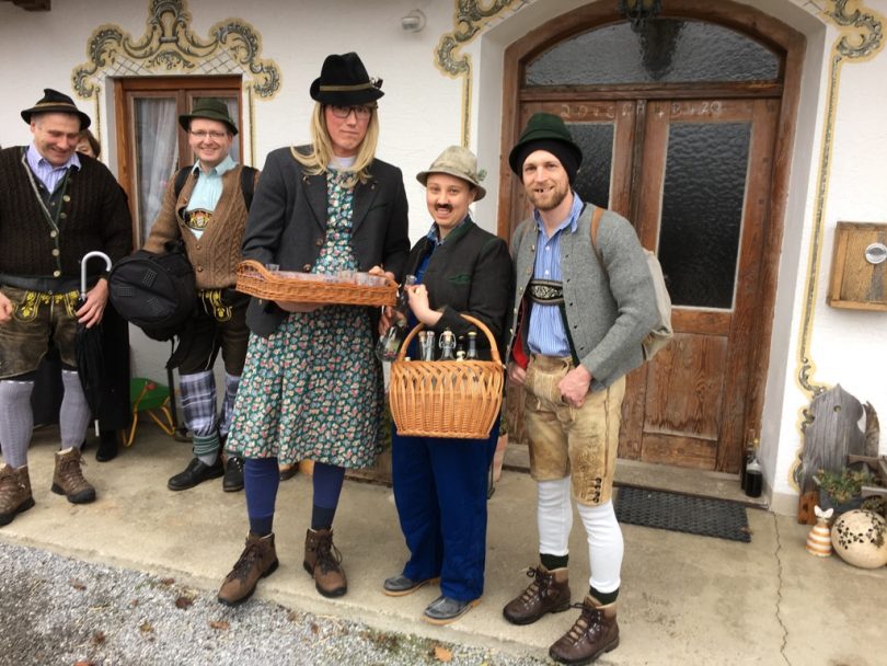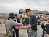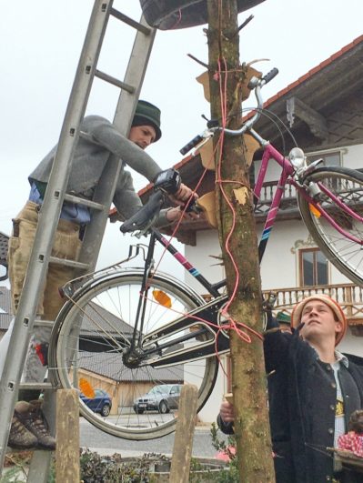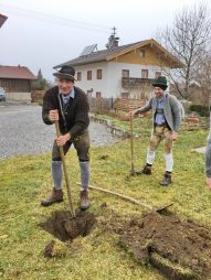 In Söllhuben dreht sich momentan alles um die bevorstehende Bettlhochzeit, die am kommenden Samstag um 12:30 Uhr beim Schwarzmo auf dem Misthaufen stattfindet. So war es am vergangenen Sonntag auch kaum zu übersehen, dass Progoda „Simandl Gscheidmaier“ mit einer Truppe von rund 40 Leut zum „Hochzeitsbaum aufstellen“ unterwegs war. Die Haustür wurde zu Ehren des Brautpaares „Lisbert und Odlgundis“ schön geschmückt. Nach anfänglichen Diskussionen ob man des Prachtstück nicht einfach an den Balkon lehnt und a bissal anspackst, wurde der Baum letzendlich doch noch ordentlich aufgestellt. Anschließend wurden die Aufsteller und Zierer mit Schnapserl, Kaffee und Kuchen versorgt.