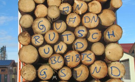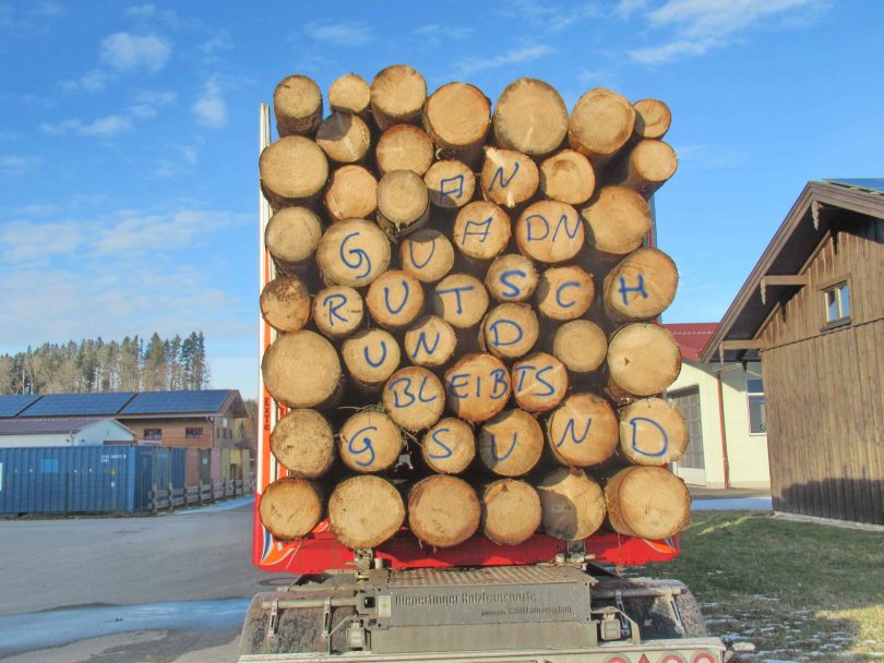 Bei einer Neujahrswanderung über leicht schneebedeckte Felder, Wiesen und den Salinweg nach Prien-Atzing erfreute das Wanderer-Auge ein für den Start nach den Feiertagen geladener Holztransporter. Dessen Unternehmer und Fahrer Hans-Peter Riepertinger wünscht in großen Buchstaben auf den noch größeren Baumstämmen den hinter ihm fahrenden Verkehrsteilnehmern ein gutes und gesundes Neues Jahr 2021 – eine freundliche Geste für unterwegs!