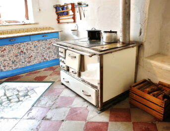 BHM_Stube Häuslmannhof.jpg: Gusseiserne Sparherde kamen ab 1870 in Mode: Die sogenannten Kochmaschinen, dieser steht in der Küche des Häuslmannhofs, benötigten viel weniger Brennstoff und lieferten neben Wärme auch heißes Wasser gleich mit. © Bezirk Oberbayern, Archiv BHM Amerang, G. Nixdorf