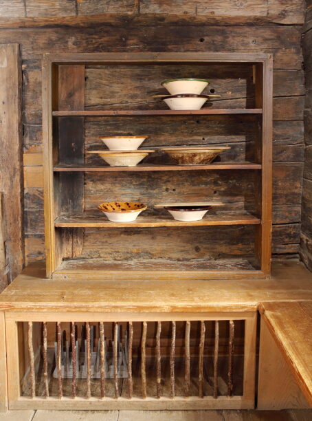 BHM_Stube Holzmannhof.jpg: In Schüsseln mit weitem Rand setzte sich langsam der Milchrahm ab, der anschließend verbuttert wurde. Mehrere Weidlinge standen, wie im Holzmannhof dargestellt, übereinandergestapelt im Regal. © Bezirk Oberbayern, Archiv BHM Amerang, G. Nixdorf