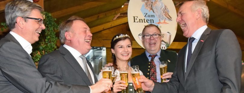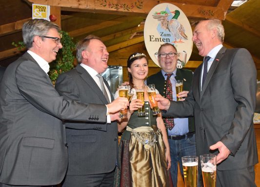 Noch bis Sonntag, 3. Dezember (täglich von 9.30 Uhr bis 19 Uhr) findet auf dem Münchner Messegelände die Messe FOOD & LIFE statt. Diese Messe ist Deutschlands gößter Trefffpunkt für Essen, Trinken und Genießen mit rund 300 Ausstellern. Zu diesen gehört auch der Entenwirt vom Samerberg, der in der Halle C 3 am Stand mit der Nummer 127 seine Entenspezialitäten sowie weitere regionalen Köstlichkeiten anbietet. Im Rahmen der Eröffnungsfeierlichkeiten schaute auch Bayerns Landwirtschaftsminister Helmut Brunner bei Entenwirt Peter Schrödl vorbei. Wie die Bilder zeigen, gab es dabei  guten Grund zur guten Laune.