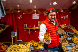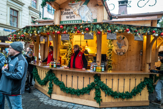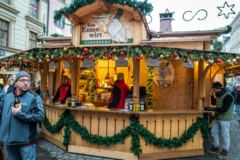 Auch in diesem Jahr gibt es beim Rosenheimer Christkindlmarkt auf dem Max-Josephs-Platz vielerlei kulinarische Köstlichkeiten. Zu diesem Angebot gehört auch der Entenwirt vom Samerberg. Bei dessen Hütte gibt es frisch gebratene Entenspezialitäten, unter anderem das Entengröstl.