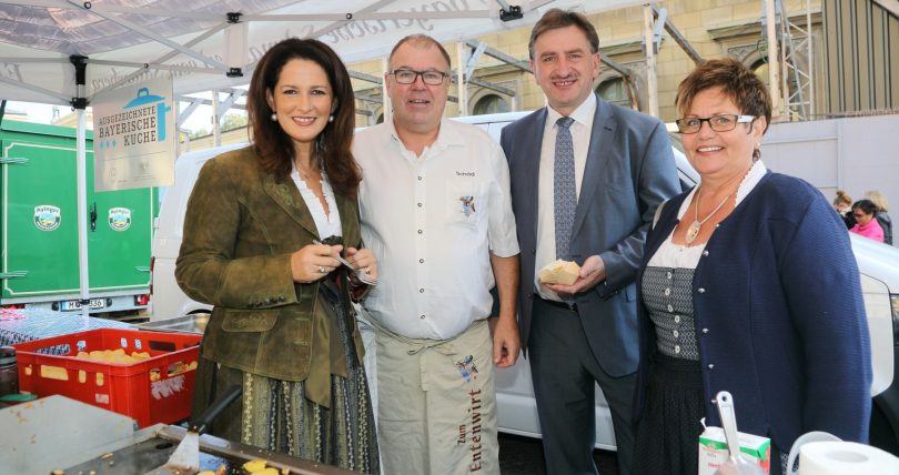 Ein gefragter Gastronom über den Samerberg hinaus ist der Entenwirt von Törwang. Dieser Tage war Peter Schrödl bei Deutschlands größtem Bauernmarkt in der München Ludwigstraße präsent und bot dabei Enten-Gröstl und Enten-Bratwürste an. An seinem Stand schauten auch die Bayerische Landwirtschaftsministerin Michaela Kaniber (li.), Landesbäuerin Anneliese Göller (re.) sowie Bauernverbandes-Vizepräsident Günther Felßner (2. Von re.) vorbei. Die Bauernmarktmeile organisierte das Bayerische Landwirtschaftsministerium. Für dieses wird der Entenwirt auch wieder tätig sein, wenn vom 18. bis 27. Januar in Berlin die Internationale Grüne Woche stattfindet. Dann wird Peter Schrödl mit seinem Team den Biergarten in der Bayernhalle bewirten.