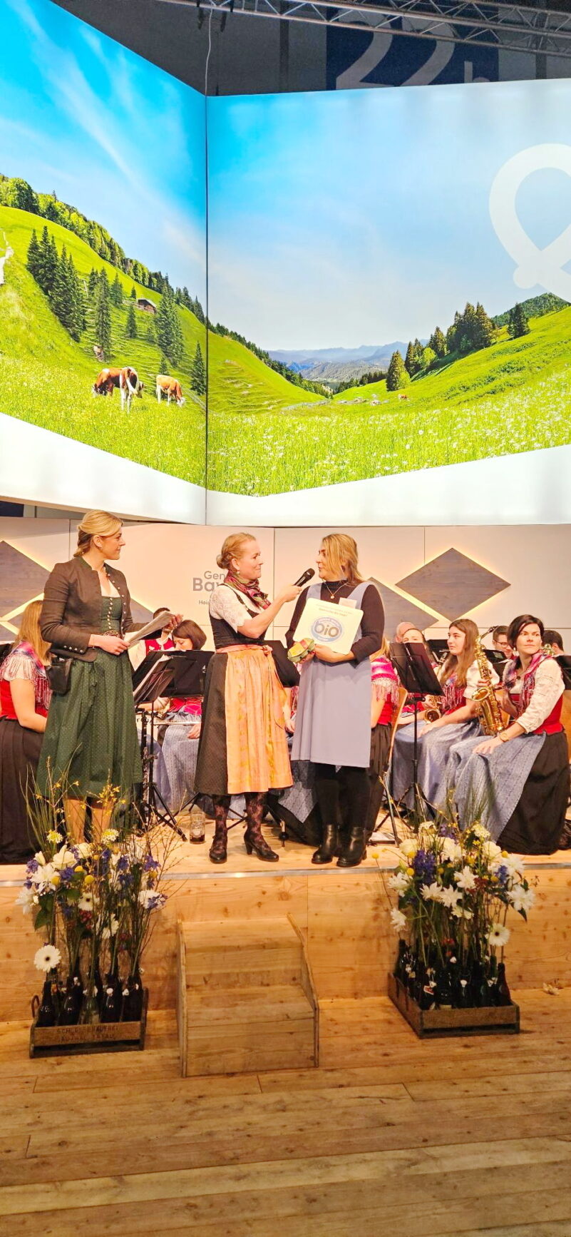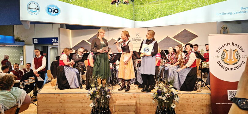 Dies erklärte bei einer Bühnenpräsentation Entenwirt-Tochter Veronika (li.) der Moderatorin Regina Wallner zusammen mit Maria Lena Hohenester, Geschäftsführerin im Team der  Landesvereinigung für ökologischen Landbau in Bayern (LVÖ) dem Berliner Messepublikum.