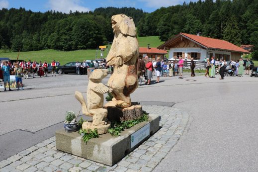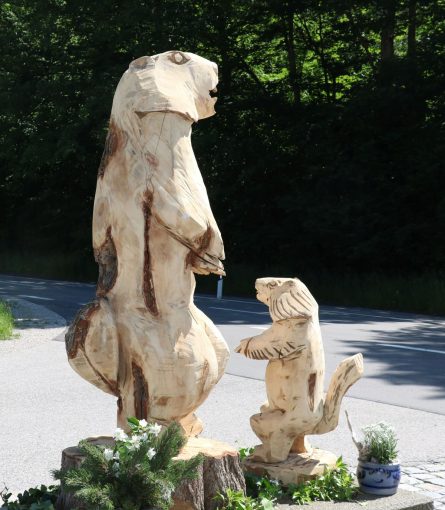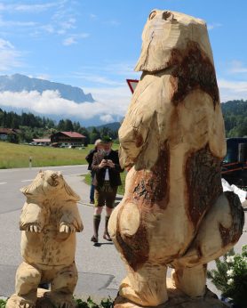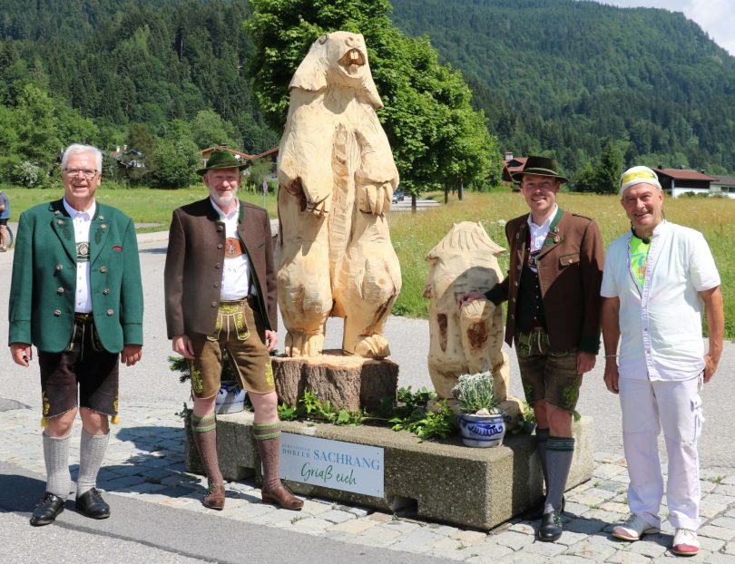 Zwei Murmeltiere bewachen künftig den südlichen Orteingang von Sachrang. „Holzsägekomponist“ Guntram Prochaska schnitzte sie beim 20. „grenzenlosen“ Sachranger Bauern- und Kunsthandwerker Markt, aber die Pandemie verhinderte bisher die Aufstellung der beiden Skulpturen. Gemeinsam mit dem Künstler enthüllten im Rahmen der Veranstaltungen zu „30 Jahre Naturschutzgebiet Geigelstein“ der Vorsitzende des Verkehrsvereins Benno Pertl, zweiter Bürgermeister Michael Andrelang und Tourismuschef Herbert Reiter die beiden „Mankeis“ an der Einfahrt ins Bergsteigerdorf. „Was könnte besser in unser Bergsteigerdorf passen, als die beiden Mankei? Lediglich ein paar Kilometer links und rechts auf den Almen im Geigelstein- und Spitzsteingebiet leben die lebendigen Verwandten unserer beiden neuen Talbewohner und wir haben uns ein paar davon ins Dorf geholt“, so Benno Pertl bei der Enthüllung des Schnitzwerkes.