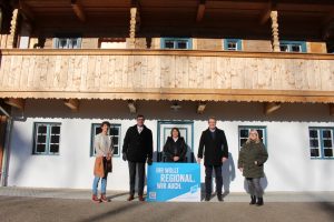 (V.l.) 1. Marktsprecherin Monika Mayr, Landrat Martin Bayerstorfer, 3. Marktsprecherin Rosmarie Voglrieder, Michael Hamburger und 2. Marktsprecherin Sandra Mair bei der Übergabe der Tafel.