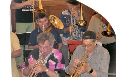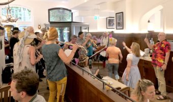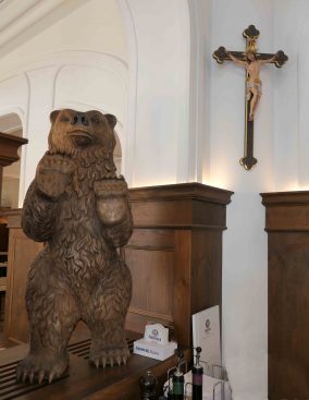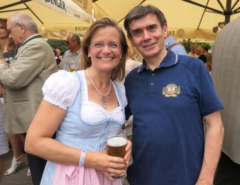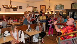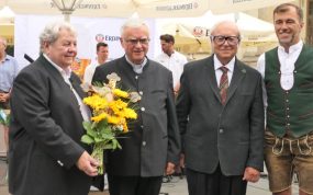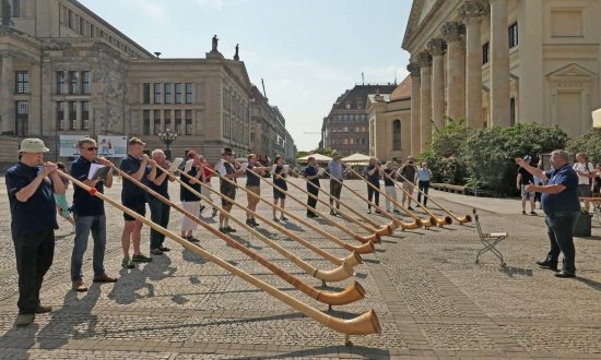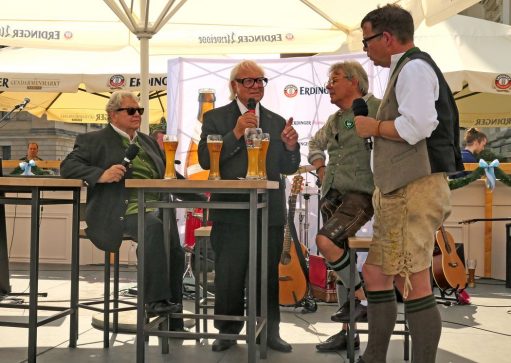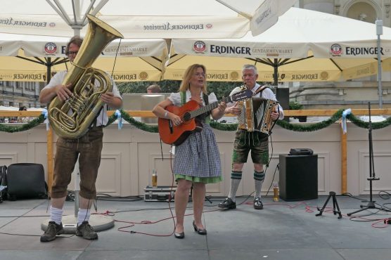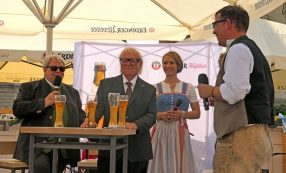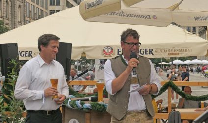 Nach einem weiteren Konzert der Alphörner auf dem Gendarmenmarkt ließ es der Wettergott dann doch „gut sein“ und zwang die Gäste bei Blitz und Donner in der Gaststube demütig unter dem frisch geweihten Kruzifix Platz zu nehmen. Dennoch ging es dann noch stimmungsvoll mit der Batzl-Blech-Musi aus Berlin bis spät in den Abend weiter. Dazwischen eine hinreißende Einlage des Berliner Blas- und Spaßorchesters „Die Tiere“. Mit Alphornklängen und einen Ständchen von Gerhild Karpf, „The Voice of Wilmersdorf“, für den Erdinger-Chef Werner Brombach fand der Abend einen klangvollen Abschluss. Am zweiten Tag der Eröffnungsfeier war dann doch wieder ein super Wetter. Bei der Aktion „ERDINGER Zauberbecher“ gab es Freibier bis zum Umfallen. Dabei konnte jeder Gast, der einen solchen Becher erwarb, diesen den ganzen Tag kostenlos wieder befüllen lassen. Zünftige bayerische Wirtshausmusik lieferten dabei die O‘-Treibern, einem Trio vom „Verein der Bayern in Berlin“. Dazwischen wieder der wohltuende Klang der Alphörner.