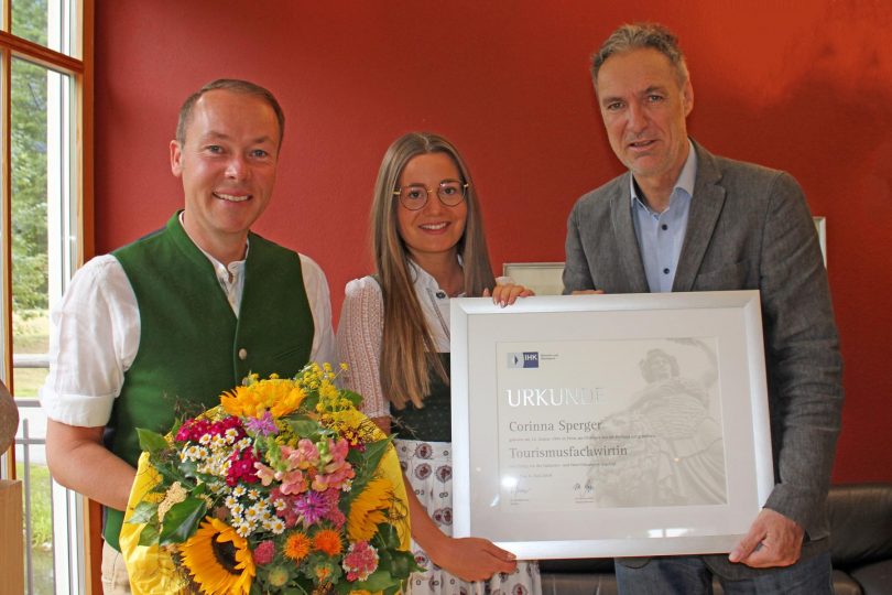 Frohe Kunde aus der Tourist-Info Aschau i. Chiemgau: Die seit einigen Jahren als Nachwuchskraft mitarbeitende Corinna Sperger hat ihre zweijährige Zusatz-Ausbildung zur „Bachelor Professional (CCI) for Tourism – Geprüfte Tourismusfachwirtin“ an der Industrie- und Handelskammer für München und Oberbayern erfolgreich abgeschlossen. Schwerpunkte der berufsbegleitenden Weiterbildung waren Tourismus Management, Marketing, Unternehmensführung, Recht und Steuern, Rechnungswesen sowie Volks- und Betriebswirtschaft. Verständlich, dass dieser besondere Ausbildungserfolg für die junge „Fachfrau im Tourismus“ von Ersten Bürgermeister Peter Solnar (rechts) herzlich beglückwünscht wurde. Lob und Anerkennung erhielt Corinna Sperger auch vom Leiter der Tourist Info Herbert Reiter (links) für ihr zusätzliches Engagement, das ganz im Sinne einer guten Tourismusarbeit zum Wohle der heimischen Anbieter und der kommenden Gäste steht. Des Weiteren ist Frau Sperger nun auch die stellv. Leiterin der Tourist Info.