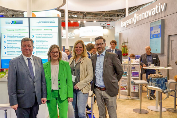 Bild 1: Prominenter Besuch am Messestand der LKZ Prien GmbH (v.l.n.r.): Christian Bernreiter, Staatsminister im Bayerischen Staatsministerium für Wohnen, Bau und Verkehr, Dr. Petra Seebauer, Geschäftsführerin der LKZ Prien GmbH, Christine Völzow, Geschäftsführerin und Leiterin der Abteilung Wirtschaftspolitik der vbw – Vereinigung der Bayerischen Wirtschaft e. V., und Georg Staller, Manager RCP Logistics Sourcing & Development bei der UPM GmbH.