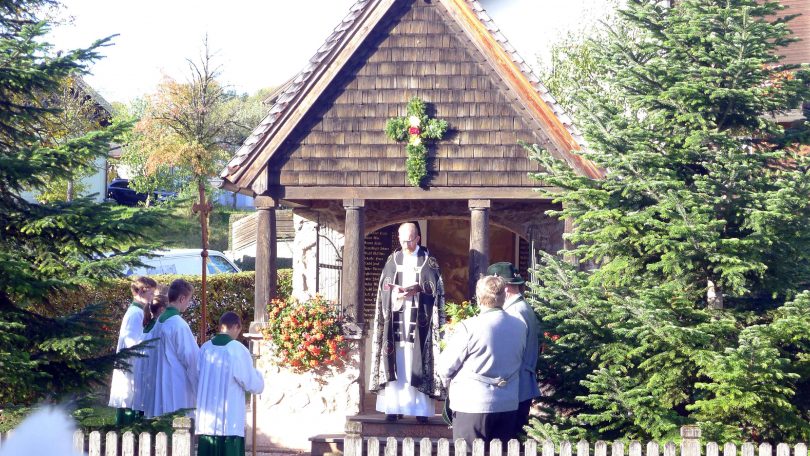 Foto: Hötzelsperger – Trachtenjahrtag im Vorjahr mit Pfarrer Klaus Hofstetter am Kriegerdenkmal in Prutdorf