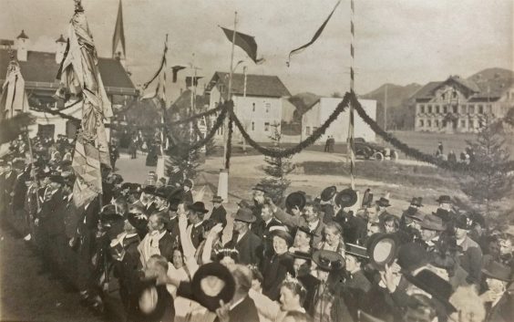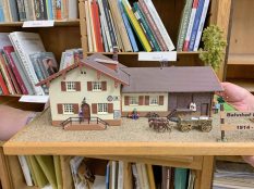 Bericht/Repro/s: Hötzelsperger – Eindrücke von der Einweihung des Bahnhofs Frasdorf im Jahr 1914 – Aufgelöst wurde er vor 50 Jahren. Foto hö: Bürgermeister Daniel Mair (li.) und Rupert Wörndl im Archiv der Gemeinde, dort gibt es auch einen Bausatz zum ehemaligen Frasdorfer Bahnhof.