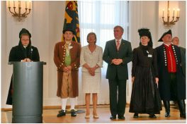 Bundespräsident Horst Köhler in Begleitung mit  seiner Ehefrau Eva Luise wies in seiner Ansprache auf das fröhliche Selbstbewusstsein von Tanz-  und Musikantgruppen sowie auf die Offenheit dieser Leute gegenüber anderen Ländern und Religionen hin. „Sie zeigen ein positives Selbstbild und sie leisten viel für die Ehrenamtlichkeit und für unser Land“, sagte der Bundespräsident, der sich schon freute, im Mai 2007 als Schirmherr beim Deutschen Kinder- und Jugend-Trachtenfest im Saarland wieder mit den frohen und frohmachenden Tänzern und Musikanten zusammenzutreffen. Knut Kreuch, Vorsitzender des Deutschen Trachtenverbandes und Oberbürgermeister von Gotha erläuterte in Versform die Bedeutung der kulturellen Arbeit in den Heimat- und Volkstrachtenvereinen in ganz Deutschland. „Unser Stolz auf die Heimat ist berechtigt, dieser wurde erst vor kurzem mit aussergewöhnlichen Auftritten und Erlebnissen bei der Fußball-Weltmeisterschaft und beim Besuch von Papst Benedikt XVI gewürdigt“, so Kreuch. Abschließend wies der Bundesvorsitzende noch darauf hin, dass 2007 in Thüringen das 100jährige Bestehen der organisierten Brauchtumspflege gefeiert wird, dass 2008 in Bayern die Gründung des ersten bayerischen Trachtenvereins vor dann 125 Jahren mit verschiedenen Veranstaltungen begangen wird und dass 2014 in Rheinland-Pfalz der 100. Geburtstag eines dortigen Trachtenfestes zur Feier ansteht. „An Ihnen, Herr Bundespräsident schätzen wir die Kraft des Wortes. Weil wir uns auch fortan wünschen, dass Sie mit Worten und Argumenten trommeln, überreichen wir Ihnen ein seltenes Exemplar einer Maultrommel“, so Knut Kreuch. Danach zeigten 24 Paare aus fast allen deutschen Bundesländern eine Deutsche Volkstanzfolge. Einstudiert wurde dieser Tanz unter der Leitung von Nicole Dlabal von der Deutschen Trachtenjugend im Rahmen eines mehrtägigen Jugendaufenthaltes in Berlin. Die bayerische Abordnung wurde geleitet vom stellvertretenden Vorsitzenden der Bayrischen Trachtenjugend Sepp Probst und es wirkten Mitglieder aus dem Lechgau und Oberen Lechgau mit. Die musikalische Begleitung mit der Ziach erfolgte durch Erhard Sebastian aus Burg. Ehe sich Bundespräsident Horst Köhler ganz persönlich von allen Landesgruppen verabschiedete, trug er sich noch in das Ehrenbuch des Deutschen Trachtenverbandes mit folgenden Worten ein: „Danke für das Engagement: Deutschland in seiner Vielfalt, Kultur und Sitte. Das brauchen wir und das macht uns Mut“.