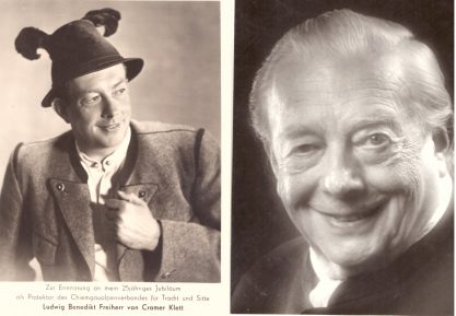 Der wie sein Vater auf Schloss Hohenaschau lebende Ludwig Benedikt von Cramer-Klett ist im deutschsprachigen Raum einer der bekanntesten und hervorragendsten Jagdschriftsteller, der sich unermüdlich für den Erhalt einer tierschutz- und waidgerechten Jagd einsetzte. Sein Wohlwollen galt aber auch noch dem Chiemgau-Alpenverband sowie seiner Heimatgemeinde. Das Anliegen, Tracht und Brauchtum zu unterstützen, übernahm er von seinem Vater, Theodor Freiherr von Cramer-Klett, dieser war ab dem Jahr 1902 Protektor über den 1890 in Rosenheim gegründeten und heute 118 Vereine zählenden Gauverband I. Der „Baron“ – wie Ludwig Benedikt gerne und volksnah genannt wurde- war den Trachtlern eng verbunden, seine persönliche Anwesenheit und auch Grußworte bei den Gaufesten und Raitener Wallfahrten sind noch vielen Trachtlerinnen und Trachtlern in guter Erinnerung. 1981 zum 75. Geburtstag wurde bei einem Festabend in der voll besetzten Hohenaschauer Festhalle dem Baron die höchste Auszeichnung des Gauverbandes durch den damaligen Gauvorstand Otto Dufter zuteil: die Ernennung zum Ehrenprotektor! Wie in der Berichterstattung des Heimat- und Trachtenboten festgehalten wurde, sagte Otto Dufter unter anderem: „In heutiger Zeit ist nur schwerlich zu verstehen, was unser Protektor in den Jahren 1927 bis 1980 alles für uns getan hat. Zu Gründerzeiten des Verbandes waren nicht nur die geleisteten finanziellen Unterstützungen notwendig, auch viel idealistische Arbeit war für das Wachstum des Verbandes erforderlich. Es ist deshalb ein Verdienst von Freiherr von Cramer-Klett, dass wir heute eine so respektable Trachtengemeinschaft sind“. In der 2006 zum 80. Geburtstag des Verbandes herausgegebenen Chronik ist die Übernahme des Protektorats wie folgt festgehalten: „Beim zweiten Gautrachtenfest in Hohenaschau 1927 wurde Ludwig Benedikt Freiherr von Cramer-Klett durch den Gauvorstand Hias Schrobenhauser feierlich das Ehrenamt eines Protektors des Chiemgau-Alpenverbandes angetragen und von diesem freudig angenommen. Der Baron, wie er zeitlebens von den Trachtlern tituliert wurde, hat dieses einmalige Ehrenamt bis zu seinem Tod im Jahr 1985 stets mit innerer Verbundenheit und besonderer Fürsorge vorbildlich wahrgenommen“.