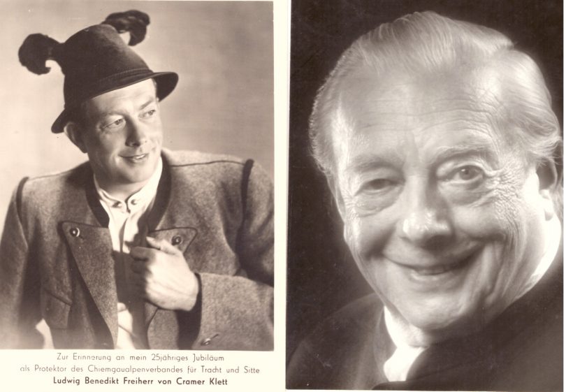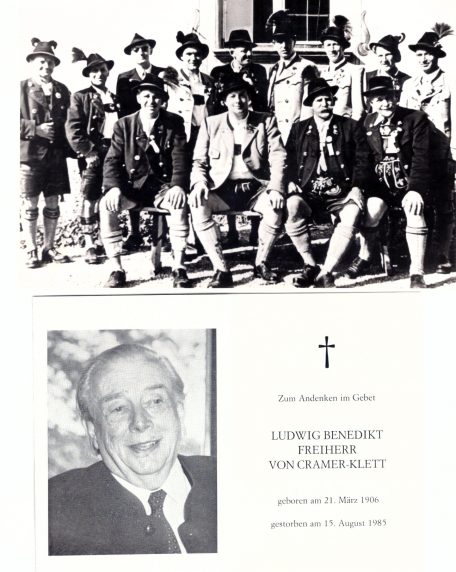 Eine bayerische Persönlichkeit verstarb genau vor 35 Jahren am Feiertag „Maria Himmelfahrt“, 15. August in Hohenaschau i. Chiemgau: es war Ludwig Benedikt Freiherr von Cramer-Klett, Ehrenbürger der Gemeinde Aschau i. Chiemgau und großer Förderer der Trachtensache. Ein Rückblick mag an die vielfältigen Verdienste eines Mannes und Wohltäters erinnern, der mit vollem Namen Ludwig Theodor Benedikt Maria Anton Sebastian Maurus Placidus Anselm Georgius Hildebrand von Cramer-Klett hieß. Er war Sohn des Industriellen, Mäzens und Reichsrats der Krone Bayern Theodor von Cramer-Klett jun. und seiner Frau Anna Chariklia, geb. Freiin von Würtzburg.