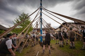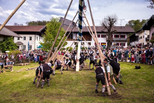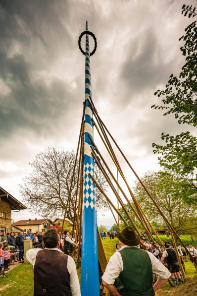 Bei herrlichem Wetter und zu diesem Zeitpunkt noch weiß-blauem Himmel, wurde mit der Aufstellung des Baumes begonnen. Hunderte von Schaulustigen waren gekommen, um nach den winterlichen Tagen bei Sonnenschein und angenehmen Frühlingstemperaturen diesem Spektakel beizuwohnen. Unter dem Kommando vom Fröschl Hans wurde der stattliche Baum von den Burschen und Mannerleut aus Altenbeuern und Roßholzen aufgestellt. Die Musikkapelle spielte fleißig und schneidig auf; für Bier, Steckerlfisch, Hendl und weitere Köstlichkeiten war gesorgt. Aber wie schon die Wetterfrösche vorhergesagt hatten, zogen viel zu früh die ersten dunklen Wolken auf. Gerade noch rechtzeitig wurde der Maibaum in die Senkrechte gebracht, als plötzlich das Wetter umschwenkte, der Wind aufkam und die ersten Gäste vertrieb. Als dann auch noch der Regen einsetzte, war das schöne Fest leider viel zu schnell wieder vorbei. Die Helfer und Gäste verteilten sich auf die umliegenden Gastronomiebetriebe, wo noch zünftig nachgefeiert wurde.