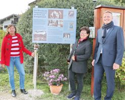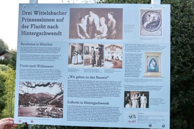 - Die Vorsitzende des Heimat- und Geschichtsvereins Dr. Natascha Mehler, die Historikerin Martina Stoib und Aschaus Bürgermeister Simon Frank vor der neuen Info-Tafel zum Gedenken an den Aufenthalt der drei bayerischen Königstöchter im Jahre 1918 in Hintergschwendt