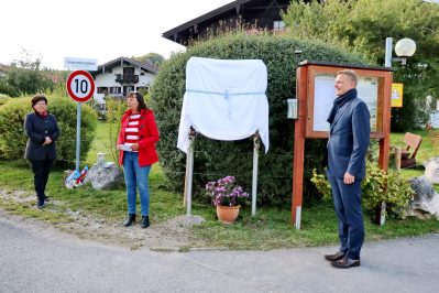 - Die Vorsitzende des Heimat- und Geschichtsvereins Dr. Natascha Mehler (Mitte), die Historikerin Martina Stoib (links) und Aschaus Bürgermeister Simon Frank bei der Enthüllung der neuen Info-Tafel zum Gedenken an den Aufenthalt der drei bayerischen Königstöchter im Jahre 1918 in Hintergschwendt