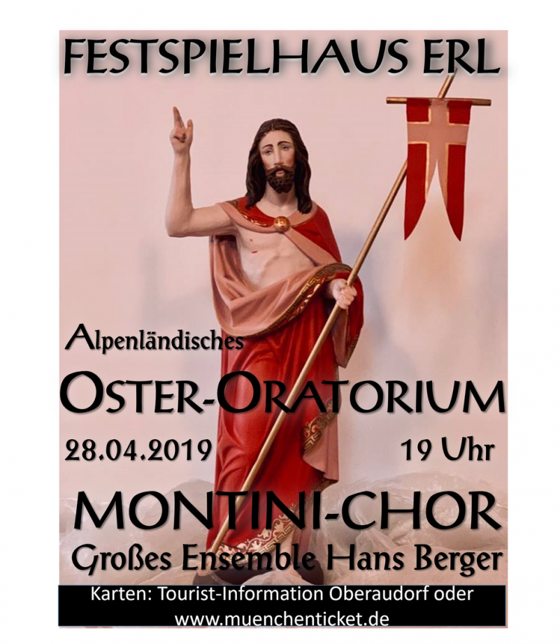 Am Weißen Sonntag, 28. April 2019, wird um 19 Uhr das „Alpenländische Oster-Oratorium“ von und mit Hans Berger im Festspielhaus Erl aufgeführt. Um 19 Uhr musizieren der Komponist und Musiker zusammen mit seinem Montini-Chor, der bayerisch-tirol. Chorgemeinschaft, ver-schiedenen Solisten und Dreigesängen sowie seinem Großen Ensemble.