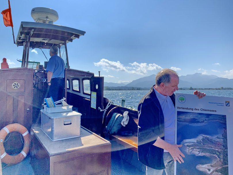 Foto: Claus Linke – Der Priener Heinz-Jürgen Pohl engagiert sich bereits seit über 20 Jahren ehrenamtlich für den Schutz der Region. Gemeinsam mit weiteren Naturführer:innen macht er den Teilnehmer:innen der Erlebnisbootsfahrten die Natur am Chiemsee auf anschauliche Art und Weise begreiflich.