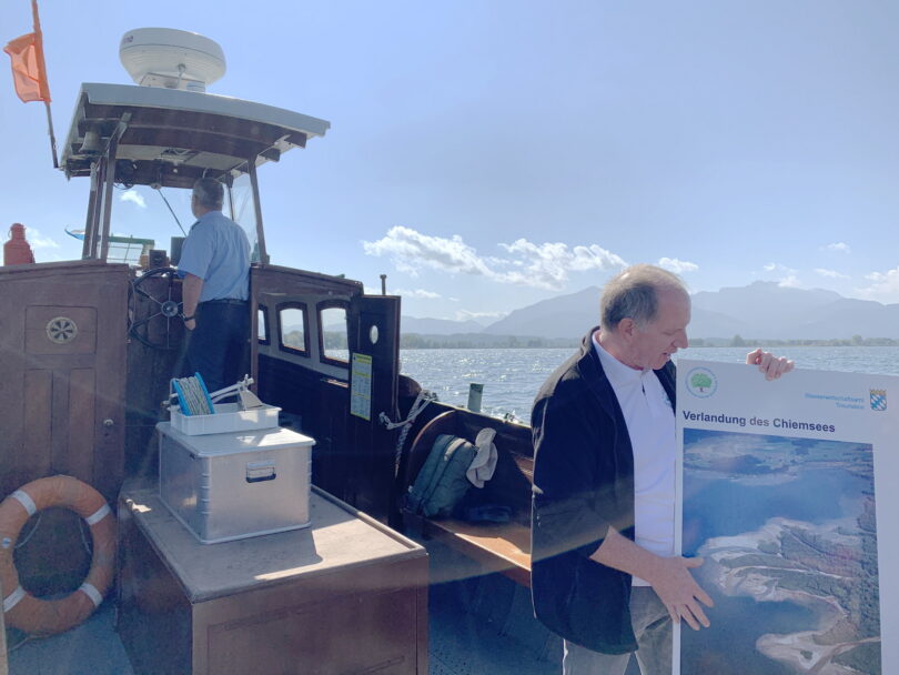 Bericht: Prien Marketing GmbH – Foto: Claus Linke: Der Priener Heinz-Jürgen Pohl engagiert sich bereits seit über 20 Jahren ehrenamtlich für den Schutz der Region. Gemeinsam mit weiteren Naturführer:innen macht er den Teilnehmer:innen der Erlebnisbootsfahrten die Natur am Chiemsee auf anschauliche Art und Weise begreiflich.