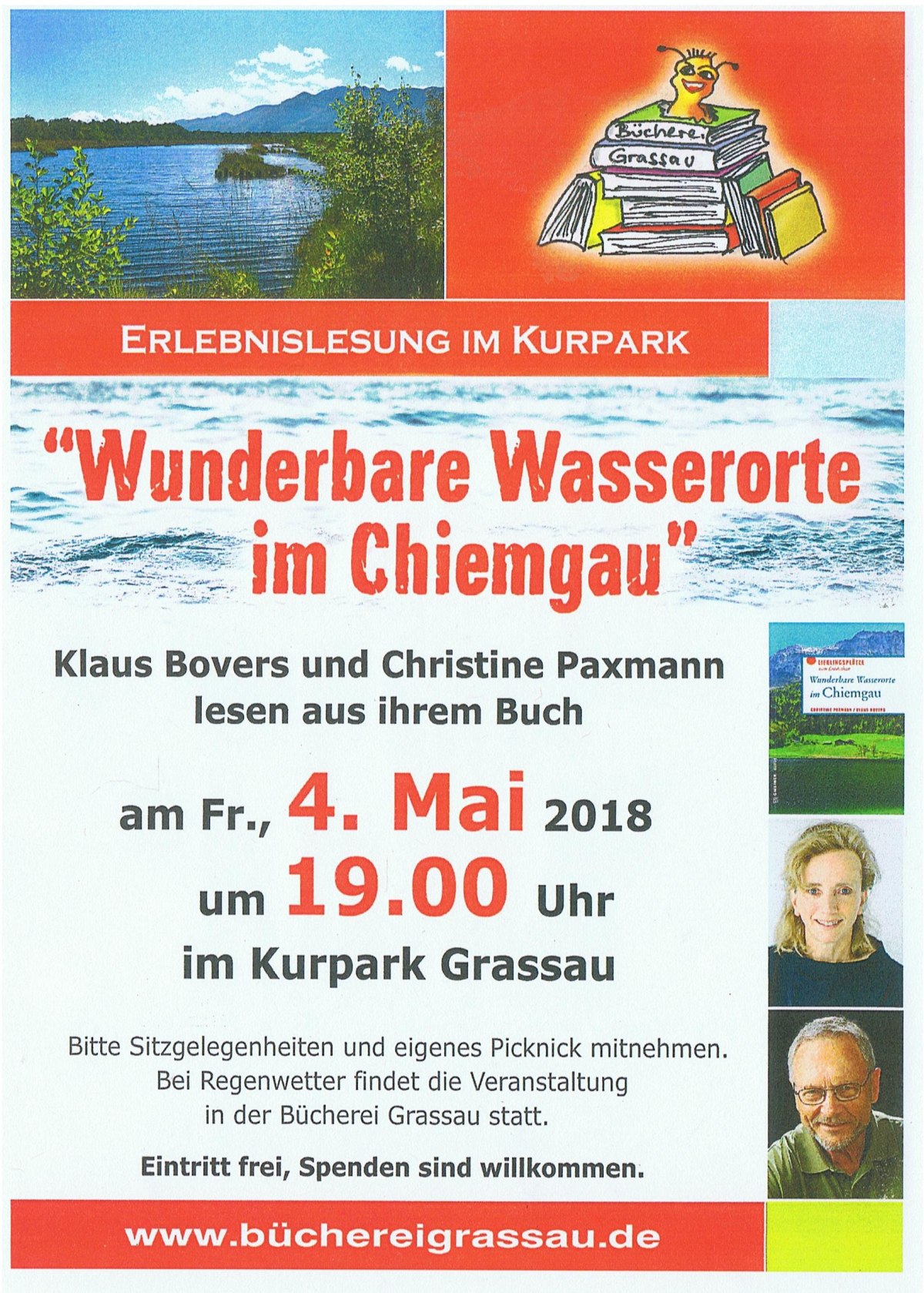 Eine Erlebnis-Lesung (mit Klaus Bovers und mit Christine Paxmann) sowie mit musikalischer Untermalung und mit dem Spiel auf der Wasser-Klangschale beginnt am Freitag, 4. Mai im Kurpark von Grassau. Der Eintritt ist frei, Spenden sind willkommen. Zum Rahmen-Programm gehören eine Adelholzener-Verkostung und gemeinsames Wassertreten im Kneipp-Becken. Nähere Informationen: www.buechereigrassau.de.