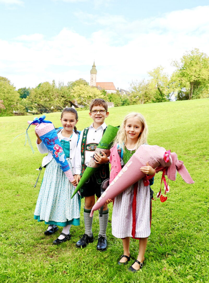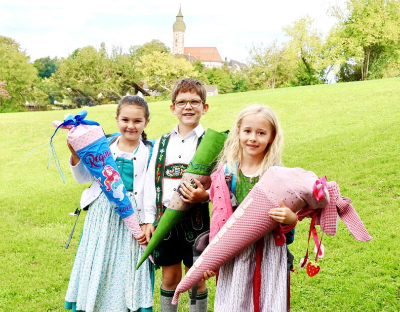 Die  drei Trachtenkinder von „Kientaler Erling“  Regina Pfänder sowie die Cousin Korbinian und Josefine Sailer sind zusammen in die erste Klasse der „Carl-Orff-Grundschule Andechs“ gekommen.
