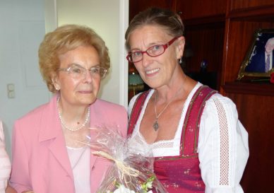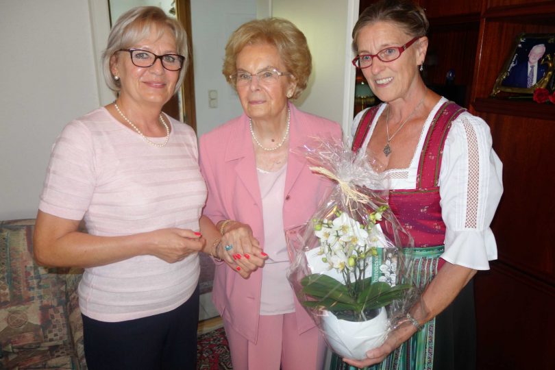 Ihren 90. Geburtstag konnte dieser Tage Ermione Roller aus Frasdorf feiern. Die Jubilarin ist gebürtige Österreicherin und seit 1945 in Deutschland. Nach dem Berufsleben als Bankangestellte in Geislingen an der Steige fand sie 1996 in Frasdorf ihre neue Heimat. Als Gratulanten für die Pfarrei Frasdorf bedankten sich Rosa Gasbichler und Johanna Abel bei der Jubilarin, dass sie trotz ihres hohen Alters noch regelmäßig bei den monatlichen Senioren-Treffs im Spritzenhäusl teilnimmt. Bürgermeister Marianne Steindlmüller überbrachte als Geschenk der Blumenliebhaberin eine Orchidee. Auf die Frage, wie sich Frau Roller fit hält, antwortete diese: „Einmal in der Woche bin ich beim Gedächtnis-Training in Prien, das macht Spaß und das möchte ich nicht missen“. Beim Besuch der Bürgermeisterin sagte Ermione Roller, dass sie es nie bereut hat, nach Frasdorf gezogen zu sein. Mit ihrer Tochter Petra Leitner unternimmt die rüstige Neunzigerin nunmehr eine Reise auf die Kanarischen Inseln, erst vor wenigen Monaten besuchte sie ihre drei Jahre jüngere Schwester in Florida. „Ich danke dem lieben Gott alle Tage für das, was ich erleben darf“, so in tiefer Zufriedenheit Frau Roller, die in ihrer Jugend eine Klosterschule mit Internat besucht hatte.