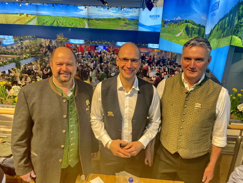 Foto: Hötzelsperger – Aufnahme zeigt bei der Vorbesprechung zum Rosenheimer Bauerntag 2023 den Referenten Ely Eibisch (Mi.) mit den beiden Rosenheimer BBV-Vorsitzenden Sepp Andres (li.) und Klaus Gschwendtner beim Treffen in der Bayernhalle anlässlich der aktuellen Grünen Woche in Berlin.