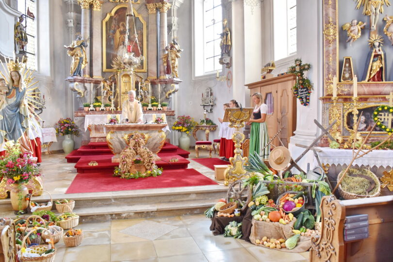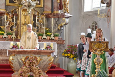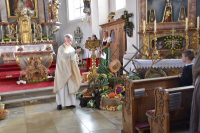 Die Kinder strömten mit ihren Erntekörbchen zur Kirche und stellten sie am festlich geschmückten Altarraum ab. Pfarrer Martin Straßer freute sich über die vielen Gaben, den Erntedankkranz mit dem Brot, den Schmuck vom Almabtrieb und über die Trachtenkinder, die die Erntedank-Messe mitgestalteten. Er bezeichnete die Kirche an diesem Tag als ein „Schmuckkasterl“, besonders auch zu dem Patroziniums-Gottesdienst für den Heiligen Remigius.