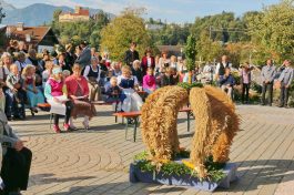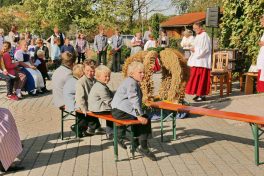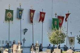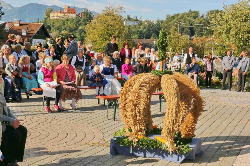 Dies gilt auch für das was uns fremd ist. Pfarrer Rudolph schloß sich dem Dank gleich an. So bei der Mesnerfamilie Leitner für die Vorbereitung am Altar und in der Kirche, bei den geschickten Händen, welche die Erntekrone gefertigt hatten, dem Altardienst und den Kindern, welche den Gottesdienst mitgestalteten. Ein weiterer Dank galt der Musikkapelle, welche außerhalb des Friedhofs Aufstellung nahm. Den weitern festlichen Rahmen bei der Meßfeier bildete die Ehrenformation der Gebirgschützen und die Fahnenabordnungen der Vereine. Auch wenn keine Prozession sein konnte, so reihten sich die Fahnenträger an der Nordseite der Kirche auf.