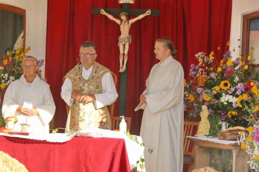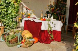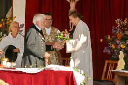 DANKE sagen war die Überschrift beim Pfarrgottesdienst zum Erntedankfest, gefeiert auf dem Vorplatz beim Leichenhaus in Altenbeuern. Danke nicht für die gefüllten Körbe des täglichen Leben, so Pfarrer Christoph Rudolph, sondern auch für die Kleinigkeiten, die man oft gar nicht bedachtet. Wir in der Pfarrei dürfen Danke sagen für eine neue Kraft, welche das Seelsorgeteam künftig unterstützen wird. Zu Beginn des Gottesdienstes wurde Frau Jacqueline Egold als neue Gemeindeassistentin vorgestellt. Der stellvertretende Pfarrgemeinderatsvorsitzende Sepp Englberger übergab ein Geschenk, verbunden mit einem herzlichen Willkommen. Mit Ihrer Predigt verband sie den Auftrag an die Kirchgänger, beim Heimweg dem Nächsten zu danken, ob Angehörger, Nachbar oder Unbekannter. Danke können wir nicht oft genug sagen,meinte Sie.
