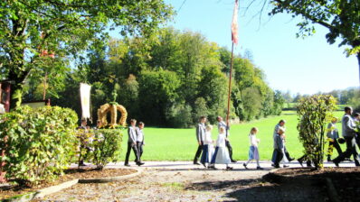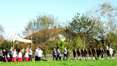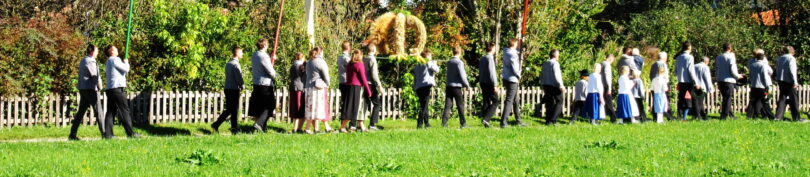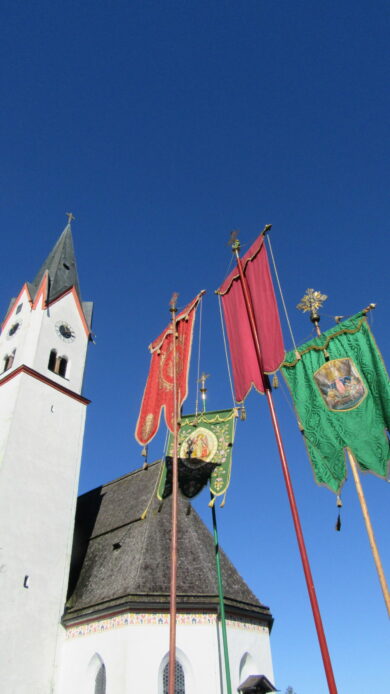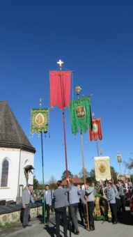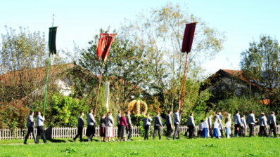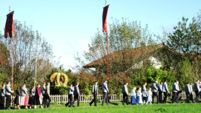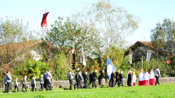 Eingebunden in die Messfeier, begleitet von einem großen Altardienst, einem imposanten Kirchenchor trugen Kinder mit Texten zum Wort Danke und den Fürbitten zum Gottesdienst bei. Die Vielfälltigkeit des Dankes vermittelte Pfarrrer Christoph Rudolph mit Worten aus der Schrift mit dem Beispiel der 10 Aussätzigen, welche geheilt wurden, sich aber nur einer bedankte. Eine heuer neu geschaffenen Erntekrone, zahlreiche Fahnen, der “Himmel”, Männer und Frauen in Tracht oder Montur zogen betend durch Altenbeuern – alles als sichtbares Zeichendes Dankes, der Tradition und der Zusamamengehörigkeit
