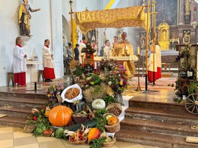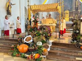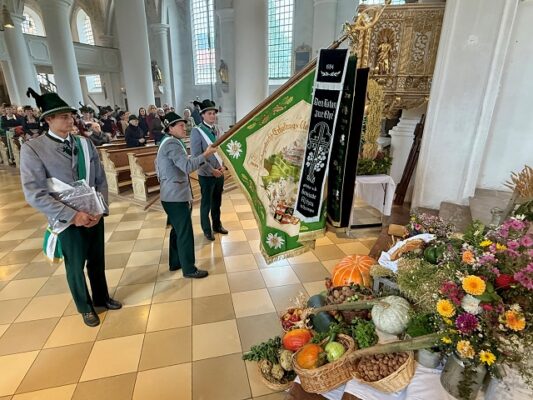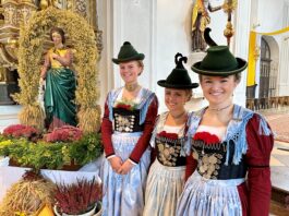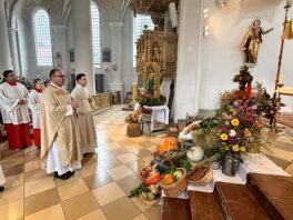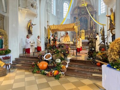 Das durchwachsene Regenwetter am Erntedankfest in Aschau i.Chiemgau brachte zwar den Segen von oben, verhinderte jedoch die geplante Flurprozession. In der katholischen Pfarrkirche Darstellung des Herrn dankten Ortspfarrer Paul Janßen und Diakon Dr. Christian Elsen für die gute und reichliche Ernte des Sommers und spendeten den Segen.
